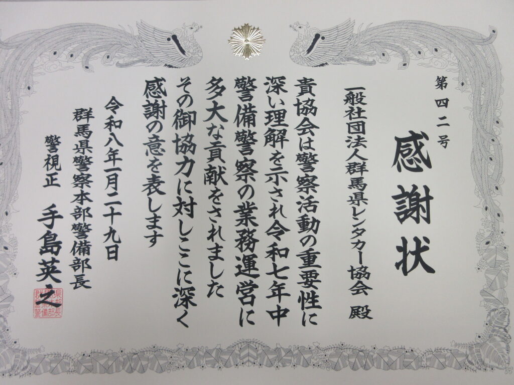 群馬県警本部より感謝状をいただきました